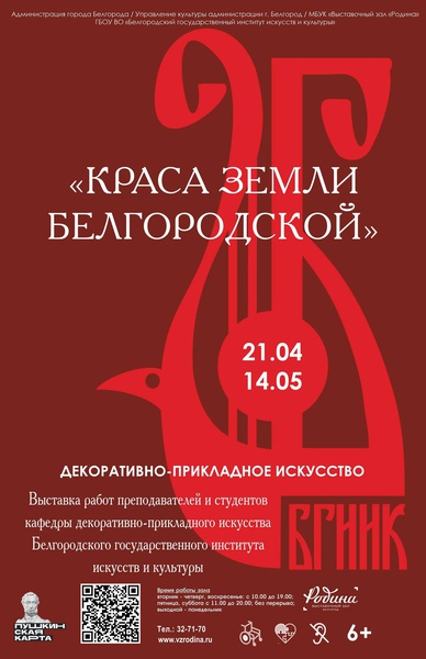 21 апреля 2023 года в 16:00 в Выставочном зале «Родина» состоится официальное открытие выставки работ преподавателей и студентов кафедры декоративно-прикладного искусства БГИИК «Краса земли Белгородской».